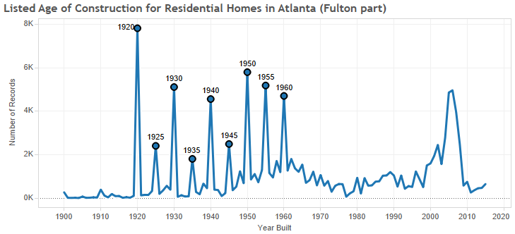 This graph also suggests that the listed age of many homes that are older than 1920 are rounded up to 1920. If you people would like to help me out, you could spend several days researching the age of your home and your neighbors' and contacting the Fulton assessment office to correct the age. I understand that this can be approximated by looking at historical plat records, but several minutes of googling didn't tell me how to find those. (Update: see links at bottom of post.)